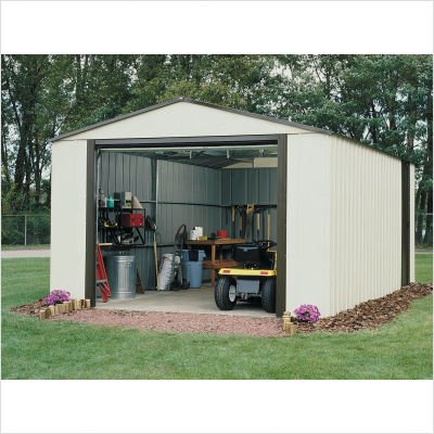 VT1431 Optional Roof Kits, Foundation Kits, Anchor Kits and shelving must be purchased separately. Optional Roof Kits, Foundation Kits, Anchor Kits and shelving must be purchased separately.Vinyl Murryhill Shed 14' x 31' For truly extra-large storage needs, the Vinyl Murryhill is your solution for organized storage. The unique roll-up, garage style door and gable roof blends with a durable vinyl coated exterior steel finish to give you maximum value for your storage dollar. Includes a sliding side door for added access to stored items. Use for storage or as a small workshop or hobby space. Features: -Long lasting vinyl-coating provides a five times thicker finish than standard steel buildings -Almond finish with gray bark roof and door jambs -Easy to assemble pre-cut and pre-drilled parts -Galvanized steel construction -Garage-style steel roll-up overhead door -Mid-wall bracing for greater all-around strength -Sliding side door for additional storage access Dimensions: -9.5'H x 14'W x 31'D Anchor Kit- Auger -Easy to install -Auger Kit: Includes four 30'' heavy duty steel augers, 60' of aircraft strength cable, and 4 cable clamps -Force of 1500 lbs. required to remove anchors from ground Anchor Kit - Concrete -Easy to install -Concrete Kit: Includes four steel corner gussets and perimeter clips -Lag bolts building directly into concrete slab -1/4 inch masonry drill bit included Shed Rack - For placement in sheds, garages, basements and any workshop -Get 15 1/2 extra square ft. of storage space -Each shelf holds up to 200 lbs. (even weight distribution) -Color: Black -No. of Shelves: 4 -Sturdy steel -Overall Dimensions: 58'' H x 36'' W x 16'' D Shelving System -Each kit contains 4 shelf brackets (8 1/2'' L), 2 pair of telescoping wall braces, complete hardware, and instructions -Made of heavy duty galvanized steel for durability -Makes it easy to build 8'' or 12'' wide shelves in any length -Perfect for all Arrow buildings, garages, basements or workshops -Shelving m